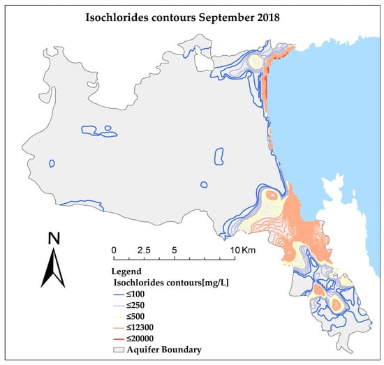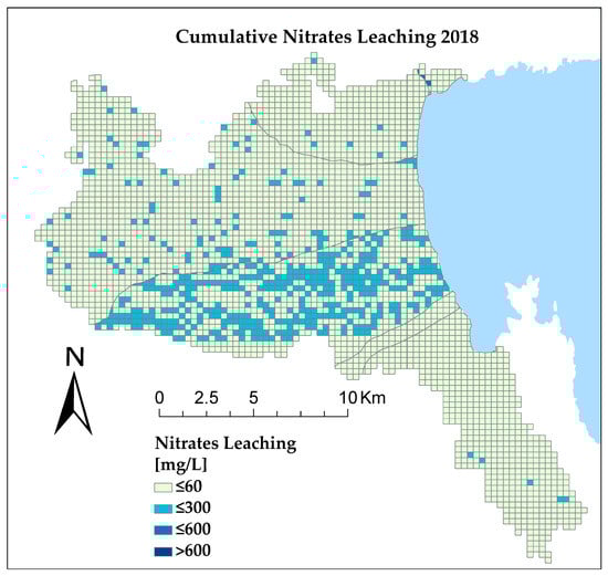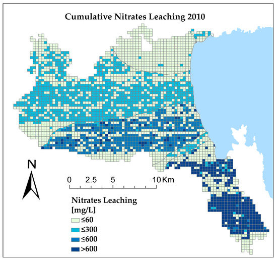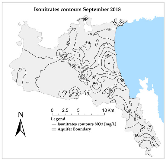 In nitrate contaminated waters, the “threshold of concern” is 25 NO3 mg/L, and mostly refers to the suitability of the drinking water. The upper safe concentration is set at 50 NO3 mg/L while higher nitrates concentrations endanger human health, surrounding ecosystems, and local biodiversity [15,16]. Thresholds of chloride concentrations have been defined as well, for the groundwater systems of more than 10 Member States of the EU. According to the Directive 2006/118/EC, the maximum allowable concentrations of chlorides range between 24 Cl mg/L and 12,300 Cl mg/L, in reliance on the diversity of characteristics of groundwater systems. The maximum allowable concentration of chlorides for urban water supply is set at 250 Cl mg/L, while in higher concentrations its consumption is traceable in taste and is also linked to health problems [17].
