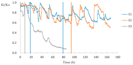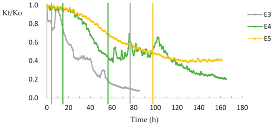 Figure 3. The highest concentration (E3) led to the fastest decline in the relative hydraulic conductivity. In the T2 stage, the permeability dropped by 87% in only 80 h, and decreased by 92% in 85 h (T3 stage). For the middle Fe (III) concentration (E4), T1 was20 h; the relative hydraulic conductivity decreased from 96% of the initial value to 40% in 20 to 60 h (T2 stage); and, after 60 h (T3 stage) to the end of the experiment (165 h), the relative hydraulic conductivity decreased from 40% of the initial value to 20%. The curve of the lowest Fe (III) concentration (E5) displays the most stable drop. T1 was 20 h; in 20 to 100 h (T2 stage), the relative hydraulic conductivity decreased from 96% of the initial value to 43%; and, after 100 h (T3 stage), the relative hydraulic conductivity was stable at 40% of the initial value.