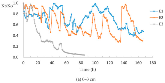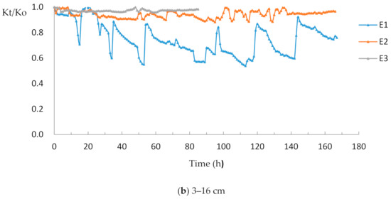 Figure 4a, were similar to the whole column’s changes, except for E1, which was similar to the whole column of 3–16 cm. E1 and E2 exhibited an oscillation decline after 10 and 5 h of the experiment start, respectively; E2 reached the stable period of large oscillation after 94 h; and the minimum relative hydraulic conductivity was 0.3.
