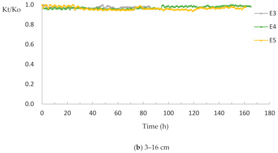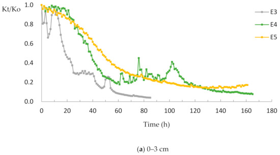 Figure 5a, were similar to the whole column’s permeability changes. The relative hydraulic conductivity at the inlet decreased steadily. At the end of the experiment, the relative hydraulic conductivities of E3, E4, and E5 were 0.04, 0.08, and 0.17, respectively. In the remaining part of the column (3–16 cm), displayed in