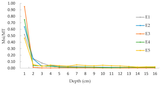 Figure 6 shows, the recharge water was fed from the bottom to the top of the column; therefore, the depth was the distance of the location from the inlet. Most Fe (III) was retained within 0–1 cm, which was the inlet section. The mass ratio (ratio of mass at si layer (Msi) to total mass (MT), Msi/MT) was well fitted by an exponential function of the column length, with the function as shown in Equation (5), which returned an estimate of the Fe (III) penetration depth for the different infiltration media and Fe (III) initial concentration, with the fitting parameters as shown in