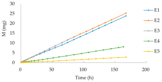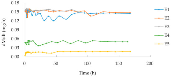 At the end of the experiment, the retention rate for all experiments had a relatively stable value: for E1, it was 0.147 mg/h; for E2, it was 0.150 mg/h; for E3, it was 0.155 mg/h; for E4, it was 0.051 mg/h; and for E5, it was 0.0175 mg/h. Eliassen [