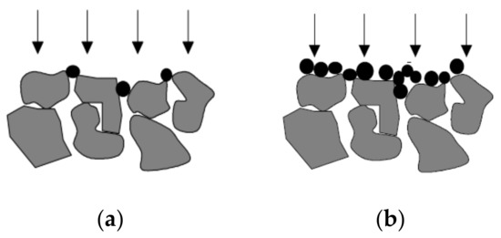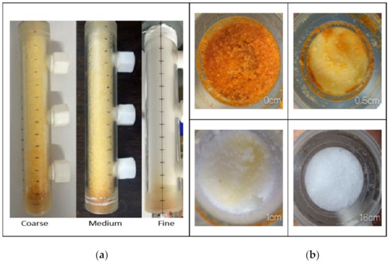 Figure 12a), and the larger the diameter of the infiltration medium, the larger the range of the red–brown sedimentary layer. The fine sand was only 0.5 cm (
