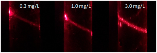 Figure 10), with the increase in the concentration, the Tyndall effect became more obvious (the red beam line became clearer), and the form of Fe (III) in solution was mostly an iron hydroxide colloid. In the colloidal solution, according to the Schulze–Hardy rule [