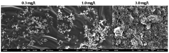 Figure 11. At 0.3 mg/L, the diameter of colloidal particles was greater than 0.1 μm. A higher concentration appeared to increase the number of iron hydroxide colloidal particles, as well as their diameter; for 3.0 mg/L, colloidal particles appeared to form a film and exhibit a diameter greater than 10 μm.