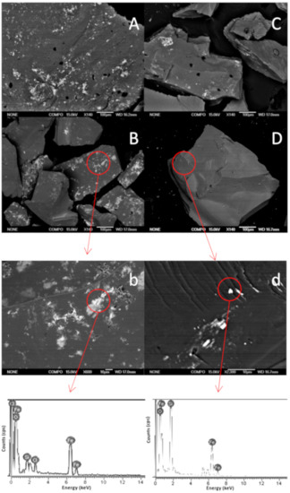 Figure 14, the white point/region on the quartz sand represents an iron hydroxide colloid. Additionally, there were two forms of iron hydroxide colloids: One was granular and attached to sand, and the other was a large-sized flocculent membrane coating the quartz sand. The flocculent mostly existed at the inlet section, as shown in