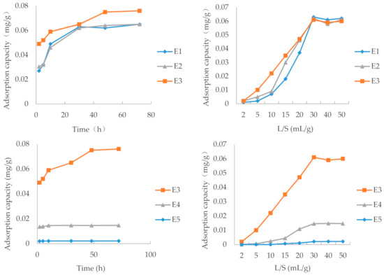 Figure 15. The best adsorption time was 48 h; the best L/S was 30; the maximum adsorption amounts of E1, E2, E3, E4, and E5 were 0.065, 0.065, 0.076, 0.015, and 0.002 mg/g, respectively; and the corresponding adsorption ratios (Ra) were 72.22%, 72.22%, 84.44%, 50.0%, and 22.22%.