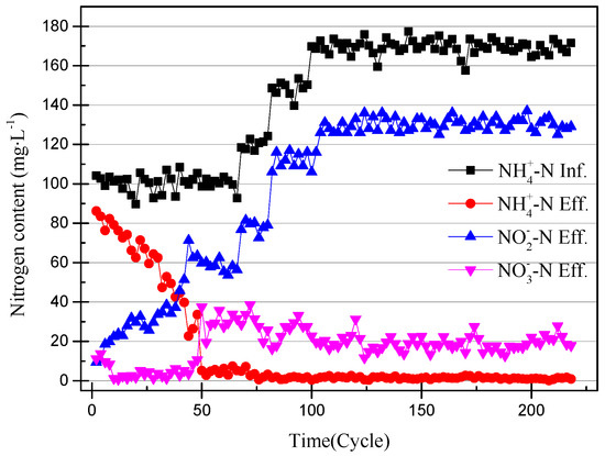 NOB will be further eliminated from the device with the operation of the SBR, because both DO and pH are not suitable for the proliferation of NOB. After increasing the alkalinity in the influent, the nitrite accumulation efficiency increases with the SBR operation, so the influent ammonia concentration was increased to 170 mg/L to obtain higher ammonia oxidation activity [20]. The NO3−–N concentration of the effluent decreases with an increase in the NH4+–N concentration of the influent, and because when there is little dissolved oxygen, AOB preferentially obtains O2 over NOB. In addition, an elevated concentration of substrate will inhibit NOB activity [21]. The data in Figure 2 and Figure 3 illustrate that the nitrite accumulation efficiency rises with an increase in the NH4+–N concentration in the influent. The average nitrite accumulation efficiency was found to be 87.22% when the NH4+-N influent was 170 mg/L.