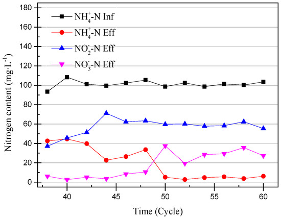 Ammonia, nitrite, and nitrate concentrations from the 38th cycle to 60th cycle.