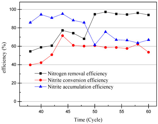 The efficiency of ammonia-nitrogen removal and nitrite conversion and nitrite accumulation from 38th cycle to 60th cycle.