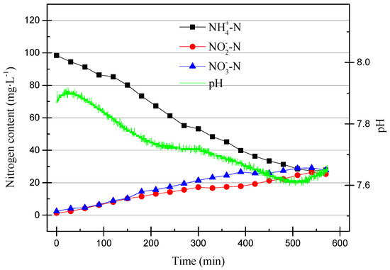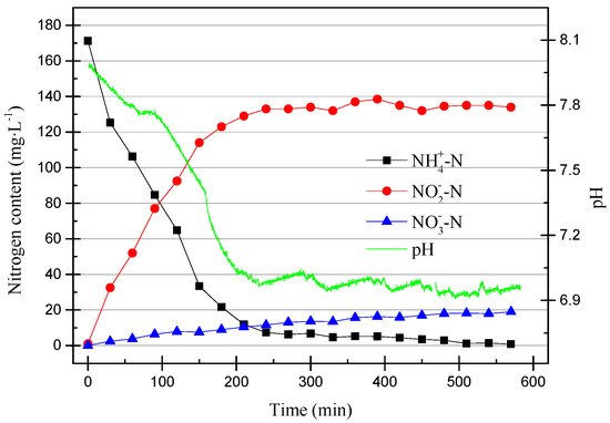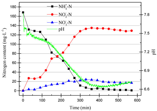 As can be seen from Figure 6, the pH dropped rapidly within the first 200 min and then stabilized at around pH of 6.9. At the same time, NO2−–N increased as the pH decreased. This was due to the ammonia oxidation reaction, which AOB participates in. The reaction is shown in Equation (1).