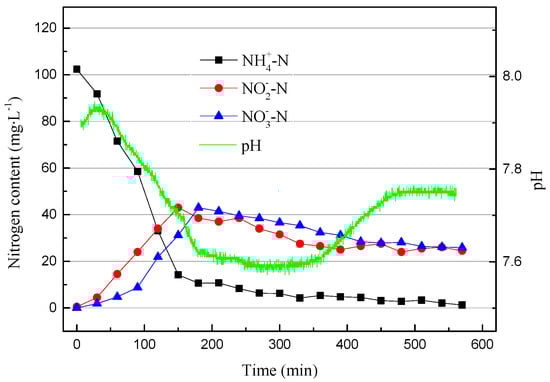 After 200 operation cycles, partial nitrification stabilized. Since it was tested every two cycles, we selected the cycle in which we changed the working conditions to see what impact this had on the partial nitrification process. After the SBR water inlet stage, the online pH meter was started, and NH4+–N, NO2−–N, NO3−–N, and total nitrogen (TN) data were measured every 30 min until the end of the reaction stage. The DO was increased at the 213th cycle from 0.2–0.7 mg/L to 0.4–0.8 mg/L (0.45 mg/L to 0.6 mg/L on average). The data from the 213th cycle are shown in Figure 6.