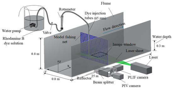 A combined PIV-PLIF technique was used in this study for quantitative velocity and concentration measurements of the near-wake region immediately downstream of the net panel. Flow seeding was provided by natural impurities in the water for PIV measurement, and Rhodamine B was adopted as the fluorescent (passive) dye tracer for PLIF measurement. A Vlite-200 dual-cavity Nd: YAG pulsed laser (15 Hz, 200 mL, 532 nm, Beam tech, Beijing, China) was placed beside the flume to produce a horizontal light sheet with a thickness of 1.5 mm. The light sheet cut through the centers of the net meshes around mid-depth to illuminate the measurement area. Two Speed Sense M120 high-speed cameras (1920 × 1200 pixels resolution, maximum frame rate 730 fps, Dan tec Dynamics) were used to capture the images for PIV and PLIF. The two cameras were mounted at right angle on a dual camera mount and captured the same field-of-view (FoV) through beam splitter optics. This camera arrangement was set on a horizontal traverse system below the flume, allowing fine adjustment of the camera positions. The cameras were positioned such that the FoVs were symmetrical about the flume centerline and focused toward the laser illumination plane. Both cameras were fitted with 50 mm f/1.8 Nikkor lenses, and the PIV and PLIF cameras were fitted with 532 nm band-pass and 570 nm low-pass filters, respectively.