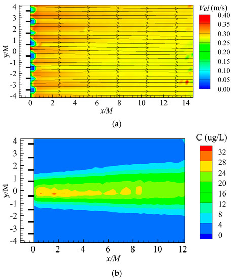Figure 2. Time-averaged (a) velocity field and (b) concentration field downstream of net for the representative case N5.