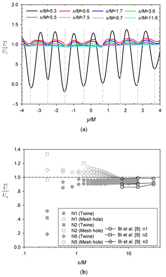 The ratio of the mean streamwise velocity to the incoming velocity U ¯ / U 0 at different longitudinal distance x/M behind the central twine and the adjacent mesh hole for the various cases (Table 1) are shown by the unconnected grey symbols in Figure 3b. The results from Bi et al. [9] (connected black symbols) are also included in the figure for comparison. The initial reduction of the velocity behind the twines (x/M~0.3) and the subsequent gradual recovery of the incoming velocity as x/M increases is clearly shown, while velocities at the mesh hole locations exhibited opposite trend of variation and appeared to approach the incoming velocity at a slower rate (i.e., over greater x/M). Similar trends with wider contrast between bar and hole locations were also reported in Gan and Krogstad [15] for wake flow generated behind a grid with a larger solidity ratio and higher incoming velocity. Notably, the velocity recovery (i.e., to U ¯ / U 0 = 1 ) was incomplete within the x/M range of our measurements, which is consistent with Bi et al. [9]. Among the different cases, the magnitude of the incoming velocity appeared to affect the ratio of velocity reduction (augmentation) more significantly than the net solidity in our experimental coverage, e.g., comparing N1 (same S but smaller U0) with N2 and N2 with N5 (same U0 but smaller S) in Figure 3b. Moreover, the net solidity of case N1 in the present study was comparable with cases investigated by Bi et al. [9] (residing between reference cases n2 and n3) with a similar incoming velocity, resulting in the associated ratio of velocity reduction also residing between these two reference cases.