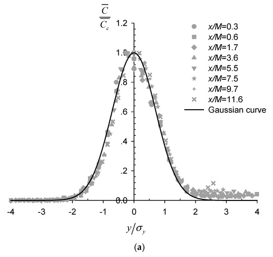 where C ( x , y ) ¯ is the time-averaged concentration at location ( x , y ) , C c ( x ) ¯ is the concentration at the plume centerline, σ y is the standard deviation in the transverse direction representing the spreading width of the scalar plume. The lateral concentration profile appears to follow Gaussian distribution regardless of the presence of the nets, even at the closest downstream location to the net panel of x/M = 0.3, with the strongly inhomogeneous wake flow field (Figure 2a and Figure 3a). This is consistent with reported Gaussian passive scalar plumes downstream of point sources in well-established homogeneous and isotropic grid turbulence [19,28]. Notably, Lemoine et al. [29] also reported self-similar Gaussian profiles of transverse concentration distribution at locations closer to the grid where the turbulence field still exhibited inhomogeneity.