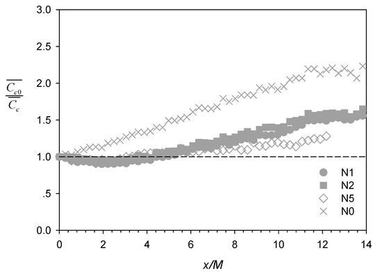 The longitudinal profiles of the inverse of scalar concentration along the plume centerline normalized by the mean concentration at the net panels, C c 0 ¯ / C c ¯ , are shown in Figure 5. In contrast to the no-net case N0, which showed a steady (and approximately linear) concentration decrease between x/M = 0 to ~11, the corresponding profiles with net panels showed a slight increase (i.e., C c 0 ¯ / C c ¯ < 1) immediately downstream the net followed by steady decrease (i.e., C c 0 ¯ / C c ¯ increasing), with the demarcation corroborating approximately with regions of turbulence production (x/M < ~3) and decay (x/M > ~3) (see Figure 6a). Lemoine et al. [29] also reported a change of slope at x/M ~ 10, after which C c 0 ¯ / C c ¯ exhibited linear growth with downstream distance, as expected for scalar transport in homogeneous and isotropic grid turbulence [19]. Another contrast is also evident further downstream between N1 and N2 (filled symbols) with the plume centerline close to net twine versus N5 (unfilled symbols) with the plume centerline aligned in the mesh hole.