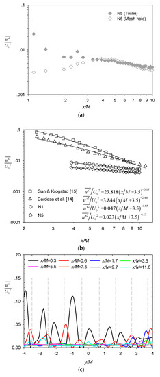 Figure 6a presents the longitudinal evolution of streamwise turbulence intensity U 2 ¯ / U 0 2 behind the central twine (filled symbols) and the adjacent mesh hole (unfilled symbols) for test case N5. Close to the net, the turbulence intensity behind the twine was significantly larger than measured at the mesh hole, with the former exhibiting two peaks (at x/M = ~1 and ~2.5) and the latter exhibiting a single peak (at x/M ~ 4). This is consistent with the patterns reported by Gan and Krogstad [15]. After x/M ~ 3, the two profiles tended to collapse and largely follow a decaying trend [14]. It is well established that the turbulence intensity follows a power-law decay in decaying grid-generated turbulence [11,12],