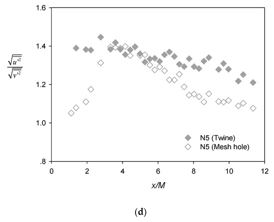 The lateral profiles of the streamwise turbulence intensity for N5 (Figure 6c) also shows that the turbulence decayed and, at the same time, became more homogeneous with increasing downstream distance x/M from the net panel. Similar to the observation by Gan and Krogstad [15], the local peaks were positioned within the strong shear regions and were slightly offset from the twine location (shown as dashed grey lines). Figure 6d shows the longitudinal profile of the turbulence anisotropy ratio, i.e., u 2 ¯ / v 2 ¯ behind the twine (filled symbols) and at the mesh hole (unfilled symbols) for test case N5. It is noted here that the anisotropy ratio was greater than unity throughout the x/M measurement range, suggesting that isotropic turbulence was not developed in this region, while the anisotropy ratio was generally larger behind the twine than at the mesh hole.