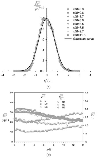 Figure 7. (a) Lateral profiles of the root mean square (RMS) of the normalized concentration fluctuation c 2 ¯ / c c 2 ¯ ; (b) Longitudinal evolution of c 2 ¯ and c c 2 ¯ / C c along the plume centerline.