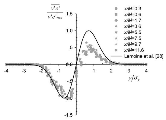 Simultaneous measurements of instantaneous velocity and concentration data allowed us to calculate their correlation and analyze the turbulent scalar flux, which is an important parameter that quantifies the turbulent mass transport. Figure 8 shows the lateral profiles of the transverse turbulent flux v c ¯ normalized by their maximum at each section. The profiles were nearly self-similar and antisymmetric about the centerline, as reported previously for axisymmetric scalar plumes from point source in grid turbulence [28]. However, deviation from the theoretical curve h ( η ) = 2 e · η e η 2 ( η = y / σ y ) , developed by Lemoine et al. [28] assuming self-similarity and the gradient-diffusion hypothesis, was still evident, especially in the positive y / σ y region. This suggests that the two assumptions were not entirely satisfied within the current experimental range.
