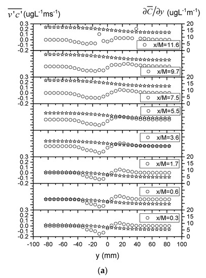 It is also informative to check whether the gradient-diffusion hypothesis that the turbulent scalar flux is proportional to the mean concentration gradient, i.e., v c ¯ = D C ¯ y , is demonstrated by the current experimental measurements. In this context, Figure 12a plots lateral profiles of the transverse turbulent scalar flux v c ¯ and transverse gradient of mean concentration C ¯ y , showing that their correlation is generally weak. This is also confirmed in Figure 12b by the lateral variability and scatter observed in the turbulent diffusivities D calculated from the ratio of the two quantities v c ¯ and C ¯ y . However, the diffusivity D is shown to become more uniform across the section with increasing downstream distance x/M, and the value at the furthest downstream location (i.e., x/M = 11.6) is also closer to the Taylor diffusivity calculated above (i.e., O(10−4), see Figure 10). These results are generally consistent with previous findings that the gradient-diffusion hypothesis is invalid in the near field region of scalar transport in grid-generated turbulence, where the turbulent flow is still subject to significant anisotropy and inhomogeneity and the plume development has not yet reached the turbulent-diffusive regime [20,32].