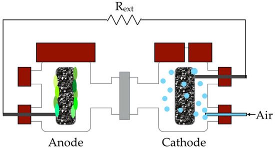 Three identical H-type MFCs were built, each with two 130 mL glass half-cells, as shown in Figure 1. The cathode and anode were composed of granular graphite (model 00514, diameter 2.5–5 mm, EnViro-Cell, Oberursel, Germany) inserted in a perforated plastic cuvette to allow dispersion-less, full contact between the graphite and anolyte/catholyte. The volume of each graphite electrode was 10 mL, with a distance between electrodes of 5 cm. A cation exchange membrane (CEM, CMI-7000, Membranes International Inc., Ringwood, NJ, USA) separated the anodic and cathodic chambers. Addition of electrodes decreased the internal net cell volume in each chamber (net anodic chamber, NAC, and net cathodic chamber, NCC) to 110 mL. Air was supplied to the cathode using an air pump to provide oxygen as a terminal electron acceptor (TEA) for the necessary cathodic reduction. Mixing was provided at the anodes by magnetic stirrers. Anodes of the MFCs were inoculated using the effluent of a long-term operating parent MFC with the addition of CH3COONa (1.5 g L−1) as an organic matter source. Once inoculated, the MFCs were fed with acetate-based solution for 30 batch cycles. After this initial phase, the MFCs were operated in batch mode using GW as the influent. Each of the MFCs was equipped with 3750 Ω external resistance (Rext); this value was chosen based on polarization and power curves observation conducted in the preliminary acetate-fed phase. A phosphate buffer solution (PBS, 10 mM, pH = 7), with the following composition: 0.507 g L−1 NaH2PO4, 0.819 g L−1 Na2HPO4, was fed to the abiotic cathodes.