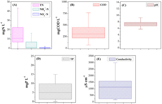 Chemical and physical parameters in greywater reported in the literature. Error bars represent the 25th and 75th percentiles. (A) Total nitrogen (TN), ammonia and nitrate nitrogen concentration; (B) Chemical oxygen demand (COD); (C) pH; (D) total phosphorus (TP); (E) conductivity. The list of the works consulted for the preparation of the figure is available in the Supplementary Materials.