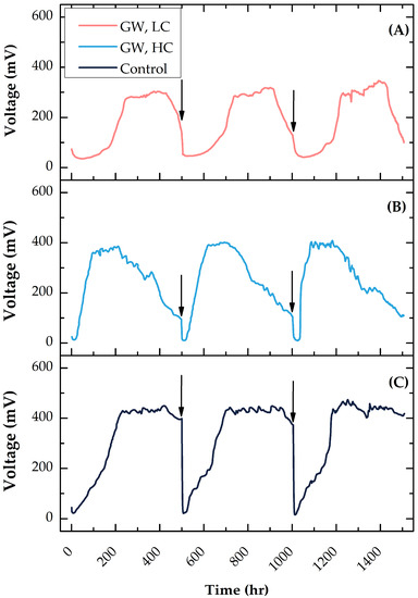 Voltage trend in the different tests. (A) GW, LC: greywater, low conductivity; (B) GW, HC: greywater, high conductivity; (C) Control: control test with acetate. Vertical black arrows represent the refresh of the MFC’s medium at the end of a batch prior to the following.
