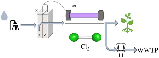 As shown in Section 3, MFC technology can remove a large fraction (>85%) of the organic matter in GW. However, this might not be sufficient to ensure compliance of current regulations for reuse, which usually require strict limits on coliform counts present in the treated effluents, even for non-potable-reuses such as toilet flushing [18,56]; this issue is shared with most conventional greywater treatment technologies [57]. MFC treatment should therefore be complemented by a disinfection stage to ensure sufficient pathogen reduction in effluents, as shown in Figure 6, although preliminary evidence suggests some disinfection capability by MFCs [58], an issue which deserves further experimental investigation. In addition, several greywater reuse regulations, including the U.S.A. [59], Canadian [60], Chinese [61,62], Japanese [63], and South Korean [64] regulations, require the presence of a chlorine residual in treated greywater intended for non-potable water reuse. Addition of chlorine-based disinfectants would then remove the presence of residual pathogens and ensure the necessary chlorine residual. Other regulations, such as the German [65], Italian [66], and Israeli [67], and World Health Organization guidelines [68], do not require the presence of chlorine residuals in the treated effluent to allow non-potable reuse. In these cases, an effective disinfection treatment could consist of UV disinfection: a stack of MFCs could partly sustain the energy requirement of a UV lamp system [69], allowing sustainable GW treatment. The development of LED UV lamps, with greater energy efficiency compared to traditional UV lamps, could improve the efficiency of similar setups. MFC/UV effluents water could then be safely used for many reuse applications. Batlle-Vilanova et al. [70] reported the simultaneous production of anodic methane and cathodic chlorine, which could be used as a disinfection agent; in the future, this may lead to a comprehensive GW treatment based solely on BESs.