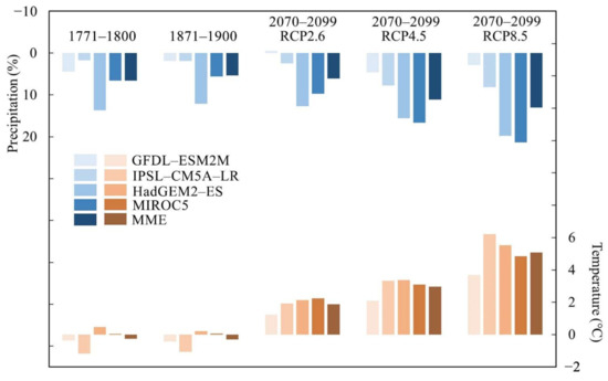 - Simulate and project the changes in temperature and precipitation over the UYRB using the four GCMs from CMIP5 for the years of 1771–1800, 1871–1900, and 2070–2099, relative to the reference period 1971–2000.