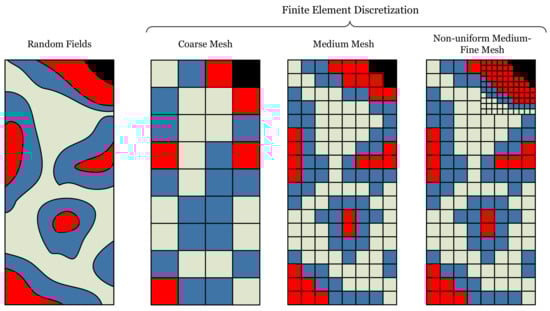 In this paper, the random fields generation is based on covariance matrix decomposition. In addition, a simple midpoint discretization technique [] is used to transfer the continuous nature of random fields into the finite element mesh. A sample 2D random fields is shown in Figure 1 including its finite element discretization with three types of meshes: coarse, medium, and non-uniform medium-fine. The non-uniform discretization is used in cases where the local response is sensitive to the property distribution in that area (e.g., local fracture). There is a direct relation between the correlation length, , and the size of the optimal mesh. The smaller the , the finer the mesh should be to properly capture the random fields transition. The number of realizations/samples is typically optimized using the LHS technique [].