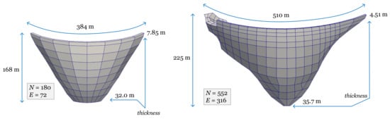 In order to evaluate the capability of PCE in conjunction with random fields in dam engineering problems, two case study dams are studied in this paper. Those two case studies have different number of random variables. Each random variable is indeed a region/element within the dam which reflects the spatial variability of material properties. In both dams, only the concrete modulus of elasticity is assumed to be random variable (due to potential aging and, therefore, reduction of elasticity), while all other material properties are kept in their mean value. One may note that concrete strength is also random (and typically is reduced due to aging); however, it is not used during modal analysis.
