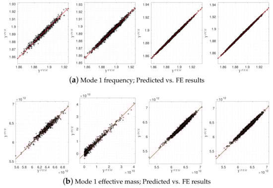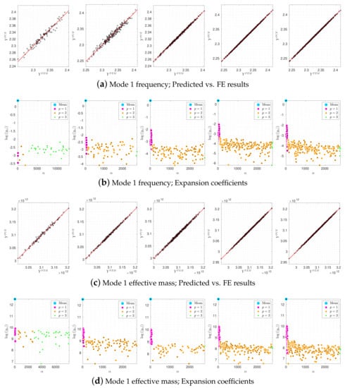 Different DOEs (with 100 to 1000 points) are used to evaluate the sensitivity and accuracy of the prediction. Figure 4 compares the response prediction via PCE and the corresponding expansion coefficients. Five initial (and deterministic) design of experiment (DOE) values are considered, i.e., 100, 200, 400, 800, and 1000. Clearly, increasing the initial sample size, increases the accuracy of PCE meta-model. In addition, it increases the number of expansion coefficients required for the meta-modeling. Qualitatively, the performance of the PCE for frequency response is very similar to the effective mass. The results of participation factor are not shown as they are very similar to other two responses.