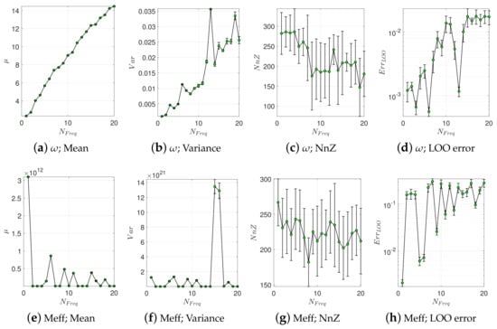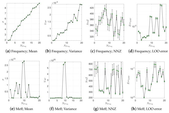 As opposed to frequency response, there is not a clear trend for the effective mass in the case of mean and variance response; see Figure 5e,f. Moreover, the NnZ has a fluctuating pattern and from mode #1 to #20 decreases from about 270 to 220; see Figure 5g. The LOO error has an oppose behavior with respect to NnZ and increases with a fluctuating fashion; see Figure 5h.