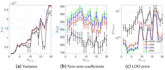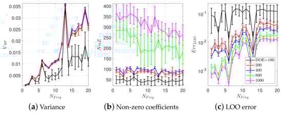 Finally, the impact of the DOE size on the quality of meta-model is studied in Figure 6 (only for the frequency response). The mean (not shown here) of different sample sizes are practically identical. The variance values have also similar trend for DOEs from 200 to 1000, while the model with DOE = 100 has different pattern; see Figure 6a. Increasing the DOE size, increases the number of NnZ coefficients; see Figure 6b. Finally, the LOO error decreases with an increase in the DOE size.