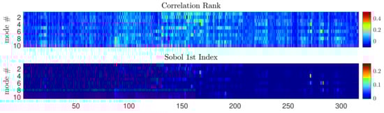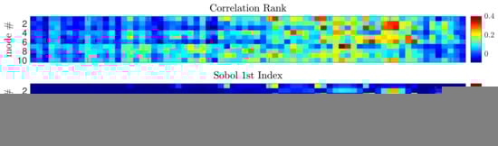 Figure 7 illustrates both the “Correlation Rank” and first order Sobol index for 10 frequencies and 72 RVs (which corresponds to spatial locations). As seen in this figure, the variation of colors which corresponds to sensitivity index is much higher in correlation rank method compared to first order Sobol index. Moreover, the correlation rank method has higher relative values. Estimation of the high sensitive RVs (locations) in both methods is close. It seems that the Sobol index filters more the RVs compared to correlation rank. Since each vibration mode is analyzed independent from others, the relative sensitivity index from one mode should not be compared to other modes (only the pattern is important).