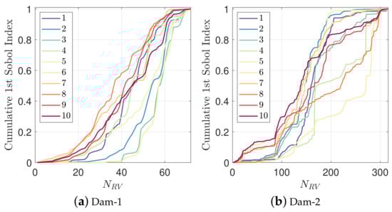 The summation of Sobol indices for all random variables is equal to one. Figure 14 summarizes the most important observations in this paper which is the spectrum of cumulative first order Sobol indices for the first 10 modes for each dam. Any sharp jump in these curves or a very steep slope indicate the importance of that particular random variable (i.e., location). These curves helps to identify the sensitive locations in dam for further inspection and potential instrumentation.