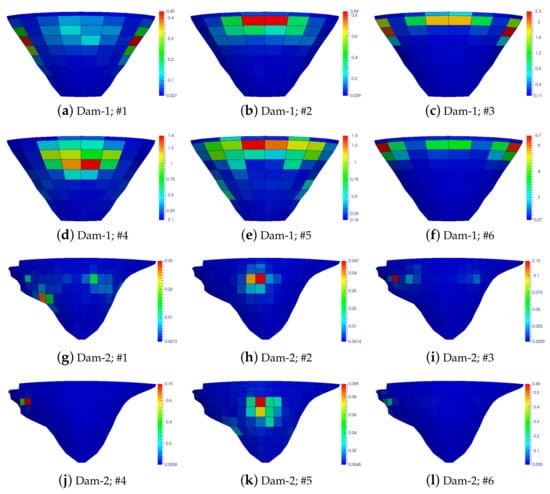 Figure 13 compares the spatial distribution of sensitivity indices for two methods using the first six modes of vibration. As opposed to Dam-1 in which there was only one layer of element withing the thickness, Dam-2 has two layers of elements. This provides the opportunity to investigate the curvature of mode shapes; thus, the sensitivity of the upstream and downstream side elements for various modes. The main observations are as follows: