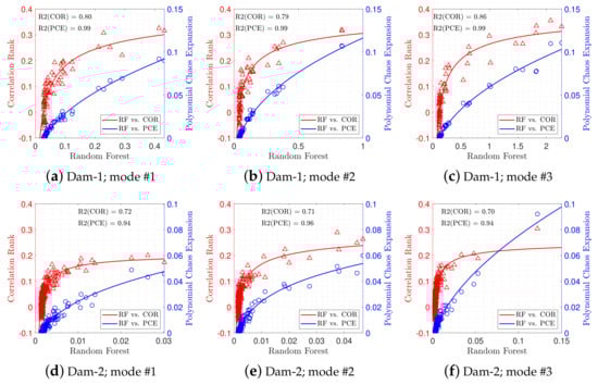Finally, Figure 17 compares the relative importance of RVs (72 RVs in Dam-1 and 316 RVs in Dam-2) from random forest (horizontal axis) with correlation Rank (left vertical axis) and PCE-based first order Sobol index (right vertical axis). As seen, there is a high correlation between random forest and PCE and coefficient of determination (R2) of 0.99 for Dam-1 and 0.95 for Dam-2. On the other hand, the random forest is less correlated with Correlation Rank method and the average of R2 is about 0.85 for Dam-1 and 0.70 for Dam-2. The reported goodness-of-fit metrics are based on a fitted power-form equation, , which shows a completely nonlinear relation between Correlation Rank and random forest, and a semi-linear one between PCE and random forest.