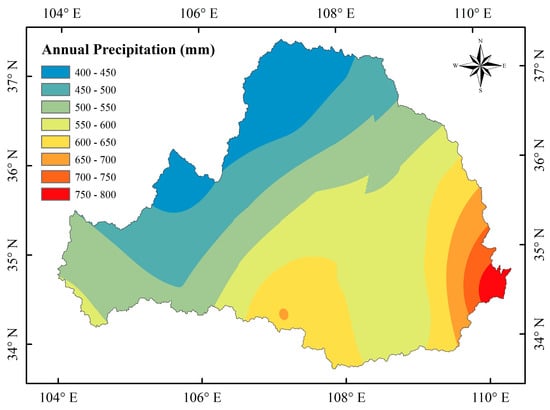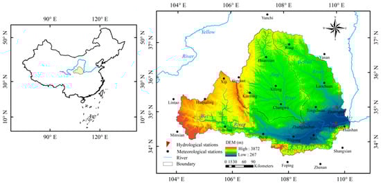 As the largest tributary of the Yellow River, the WRB is located in the lower midstream of the Yellow River. The total area is approximately 1.348 × 105 km2, and the main stream is 818 km in length. The basin originates from the Niaoshu Mountain of Gansu Province and Baiyu Mountain in the north, reaches Tongguan in the east and the Qinling Mountains in the south, and flows through the three provinces of Shaanxi, Gansu, and Ningxia. The basin is divided into three larger sub-basins with distinct geographic and climatic conditions: the Wei River, the Jing River, and the Beiluo River, known as the Jing-Luo-Wei Region. Among them, the Wei River has the largest area, 7.23 × 104 km2, and is located to the south of the whole basin with a long east–west direction belonging to the Guanzhong Plain. Jing River is the next largest, with an area of 4.54 × 104 km2, and is located on the north bank. The smallest area is the Beiluo River, 2.69 × 104 km2, located in the eastern part of the whole basin and accounting for 20% of the total basin area. The Wei River Basin is located in the transition zone between arid and humid regions. It belongs to a typical continental monsoon climate, making it dry and cold in winter and humid and hot in summer. The average annual rainfall in the area is 572 mm. The interannual variation of the rainfall is large, and the distribution is uneven during the year, mainly in summer (July–October), accounting for more than 60% of the annual rainfall. In winter (December–February), the rainfall is scarce, accounting for about 4% of the annual rainfall (Figure 1).