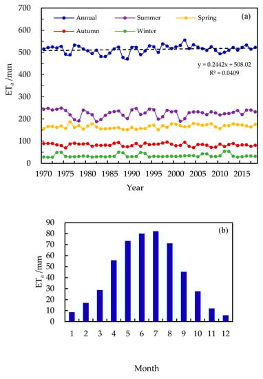 The variation of the annual, seasonal and monthly ETa in the Weihe River Basin from 1970 to 2018. (a): Annual and seasonal; (b): Monthly.