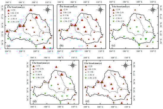 The values of Mann–Kendall test results of the ETa during 1970–2018 ((a): Annual, (b): Spring, (c): Summer, (d): Autumn, (e): Winter).