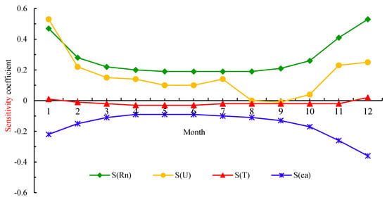 The monthly sensitivity coefficients of the meteorological variables showed that the sensitivity coefficients of ETa to solar radiation and wind speed are positive, indicating that ETa experiences an increasing trend with an increase in solar radiation and wind speed (Figure 5). The ETa sensitivity coefficient to solar radiation is between 0.19 and 0.53, with the maximum in December and the minimum in August. The sensitivity coefficient to wind speed is between −0.01 and 0.53, with the maximum and minimum values in January and August, respectively. The sensitivity coefficients of ETa to mean temperature and vapor pressure all have negative values (except for the positive temperatures in December), indicating that the ETa decreases with an increase in mean temperature and vapor pressure during the year. The sensitivity coefficient of ETa to mean temperature is between −0.03 and 0.02. The maximum occurs in December, and the minimum occurs in June. The sensitivity coefficient to vapor pressure is between −0.36 and 0.09; the maximum occurs in June, and the minimum occurs in December. In addition, the change curve for the sensitivity coefficient of ETa to solar radiation and vapor pressure changes symmetrically.