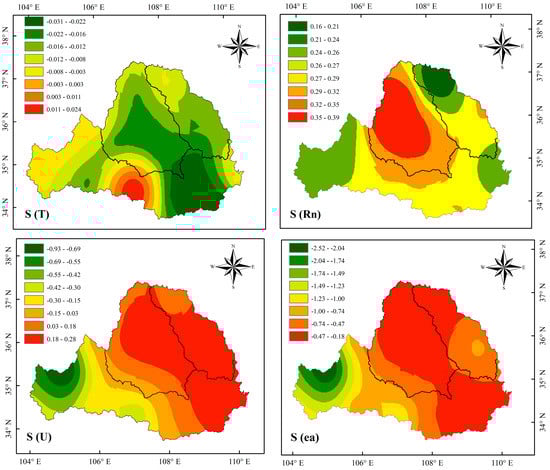 The spatial distribution of the annual sensitivity coefficient of the ETa in the WRB from 1970 to 2018 is shown in Figure 6. The sensitivity of ETa to different meteorological variables has a certain zone distribution. Based on the distribution analysis of the ETa to the mean temperature sensitivity coefficient, the sensitivity coefficient value is distributed between −0.03 and 0.02. The high-value areas mainly occur around the Baoji station and the main stream of the Wei River, where the sensitivity coefficient values are positive, while the rest of the stations in the basin have negative values, and low-value areas are mainly distributed in the southeast of the basin. Based on the distribution analysis of the ETa for the solar radiation sensitivity coefficient S(Rn), the sensitivity coefficients are mainly distributed between 0.16 and 0.39; the high value areas are mainly distributed in the upper reaches of the Jing River, and the sensitivity coefficients of the whole basin all have positive values, indicating that the ETa of the entire basin increases with an increase in solar radiation. The low-value areas are mainly distributed around Wuqi station in the upper reaches of Beiluo River, with an area smaller than the high-value area. In addition, a similar spatial distribution of sensitivity value changes can be observed for wind speed and vapor pressure, which have a coherent spatial pattern, and both show a decreasing trend from west to east. The high-value areas are mainly located in the middle east of the basin, while the low-value areas are located in the west side of the basin. The high-value areas of wind speed and vapor pressure account for nearly half of the basin’s area.