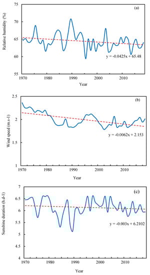 Overall, the change of different meteorological variables during 1970-2018 showed in Figure 7, it can be concluded from the above analyses that the increasing vapor pressure or decreasing relative humidity is primarily responsible for the ETa changes in the WRB. The relative humidity is mainly determined by the vapor pressure, so the relative humidity is the dominant meteorological factor that affects the ETa in the WRB. Similarly, differences in the controlling climatic factors have also been identified in many other regions. Jung et al. (2010) [35] and Marshall (2012) [66] found that the general global average annual evapotranspiration increased from 1982 to 1997, but after the strongest El Niño phenomenon happened in 1998 the global evapotranspiration growth trend seems to have stopped, and the global average land evapotranspiration decreased. This change in evapotranspiration is mainly due to the moisture limitations in the southern hemisphere, especially the weakening of water vapor sources in Africa and Australia (Jung et al., 2010) [35]. On the other hand, this study region located in the southeast portion of the Yellow river, where the moisture introduced by the southeast monsoon from the South China sea and/or Bohai combined with topographic factors can directly influence the relative humidity [58]. Relative humidity is affected by vapor pressure, and saturated vapor pressure has a direct relationship with temperature. Therefore, increasing the temperature would lead to increasing the saturated vapor pressure, further causing a decrease in relative humidity and eventually an increase in evapotranspiration. Zhang (2011) [67] also found that relative humidity is the most sensitive factor for changes in the reference evapotranspiration in northwest China and attributed the decrease in relative humidity in NW China to increases in precipitation. NW China is characterized by an arid climate, and a reduction in precipitation will cause an increase in relative humidity.
