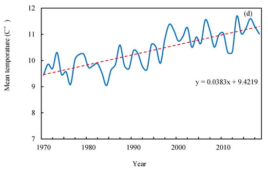 In recent centuries, the global climate has experienced a significant warming trend, and the issue of climate change has drawn much attention from the public, academic circles, and governments [9]. The fifth report of the IPCC noted that during the years from 1880 to 2012, the global average temperature on land and sea increased by 0.85 °C. According to paleo climatological data, the years from 1983 to 2012 may have been the warmest in the past 1400 years [10]. In this context, it is believed that global warming will dry out the surface atmosphere and increase the evapotranspiration of the soil surface and the crop, which will cause a series of water cycle changes [1,11]. A large number of current results show that there has been a continuous decrease in the evapotranspiration of evaporating pans around the world. The rate of this decrease was about −1~−5 mm·a−10 in the past 50 years [12,13,14]. The potential evapotranspiration (ETp) in many countries and regions also shows a decreasing trend, while the temperature shows an increasing trend: Italy [15], India [16], Australia [17], Israel [12], New Zealand [18], the Canadian Prairies [19], and Japan [20], as well as some regions of China, have observed the same phenomenon [21,22,23]. Roderick (2002) called this the “evapotranspiration paradox” for the first time, as a hydrological phenomenon featuring a significant increase in air temperature accompanying a significant decrease in evapotranspiration [24]. The same phenomenon was also reported in studies on the analysis of ETp and the actual evapotranspiration ETa, such as the reference evapotranspiration in the middle and southwest areas of the Yellow River Basin [25]; potential and pan evapotranspiration in the Changjiang (Yangtze River) catchment [26]; ETp in the eastern plain area of the Aksu River Basin [27]; ETa in the pearl river basin [28]; and ETa in the Yangtze River [29]. The results of existing studies showed that the attributions of different factors to the trend of evapotranspiration are inconsistent among different studies. Some studies reported solar radiation was the dominant factor for the decrease of evapotranspiration in the Iran [30], northeast India [31] and middle-lower Yellow River Plain [25]; Liu [32] observed a decrease of evapotranspiration in the Haihe River Basin attributed to wind speed; and some other studies reported that relative humidity is the dominant factor decreasing evapotranspiration in the Aksu and Heihe River Basins [27,33]. In addition, Irmak et al. [34] and Jung et al. [35] found that limited moisture supply could be the dominant factor driving changes in ETa.