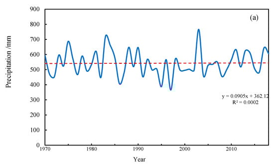 Based on the previous results, it can be seen that the total contribution of meteorological factors to the ETa changes is negative, but the ETa in this study area is increasing. Therefore, the factors affecting the changes of ETa in the WRB are complicated and comprehensive and are caused by a combination of climatic conditions and land surface conditions. Changes in precipitation are also closely related to changes in ETa. Similar to the changes in the average multi-year ETa, the precipitation changes also showed a slight increase (Figure 8). The spatial distribution of precipitation in the WRB is shown in Figure 9a, where it can be seen that precipitation in the WRB decreases from southeast to northwest. Similar changes can be observed in the average multi-year, summer, and autumn ETa values. The precipitation in the WRB is mainly concentrated in summer and autumn, especially from June to August, indicating the ETa in summer and autumn, to a certain extent, is affected by precipitation.