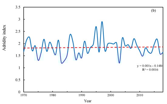 Rainfall mainly promotes evapotranspiration in two ways. On the one hand, it increases soil water content [68]. The decline in global land surface evapotranspiration from 1998 to 2008 was mainly due to the decrease of soil moisture [35]. On the other hand, rainfall can also promote vegetation growth. Using Pearson’s correlation analysis, the correlation between precipitation and ETa in the whole basin reached a significance level of 0.01 (p = 0.50), and the ETa increased with an increase in precipitation. Evapotranspiration plays an important role in water and energy balance, and changes in evapotranspiration will also cause changes in the hydrological cycle. The Adridity index (AI) is usually used to evaluate the wet and dry state of a basin and is commonly expressed as the ratio of potential evapotranspiration to precipitation [69]. It can be seen from Figure 9b that the climate in this basin is experiencing a state of long-term drought (AI greater than 1), although the AI presents opposite characteristics of change compared to the precipitation, as the overall trend of change is relatively gentle. There was, however, a significant increase in 1997 and 1995, mainly due to the decrease in rainfall during this period.