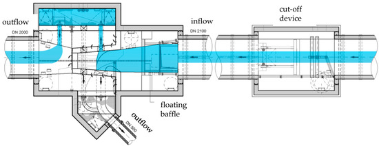 Technical drawing of the stormwater treatment facility with all aggregates in the initial position (dry weather conditions).